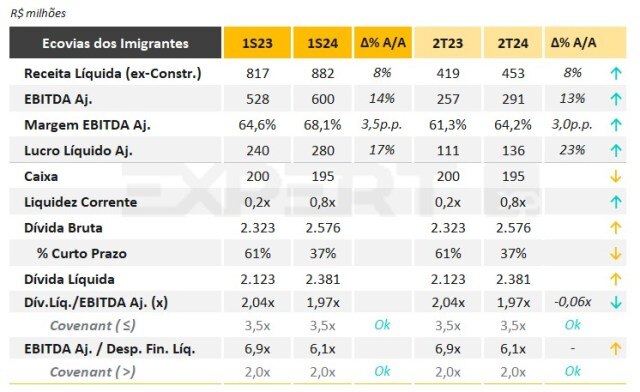 No 2T24, Ecovias dos Imigrantes atingiu receita líquida de R$ 453 milhões (+8% A/A), EBITDA ajustado de R$ 291 milhões (+13% A/A) e lucro líquido de R$ 136 milhões (+23% A/A). A melhora dos indicadores financeiros foi reflexo, principalmente, do crescimento de 8% do tráfego de veículos e reajuste de tarifas de pedágio, que aumentaram 5% em média em relação ao 2T23.