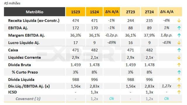 Desde 31 de dezembro de 2023, está sujeita a cumprir com índice de cobertura do serviço da dívida (ICSD*) igual ou maior do que 1,2x. A distribuição de dividendos passou a ser permitida apenas nesta mesma data, caso o ICSD seja igual ou superior a 1,3x. No 2T24, o MetrôRio estava em conformidade com seus covenants.