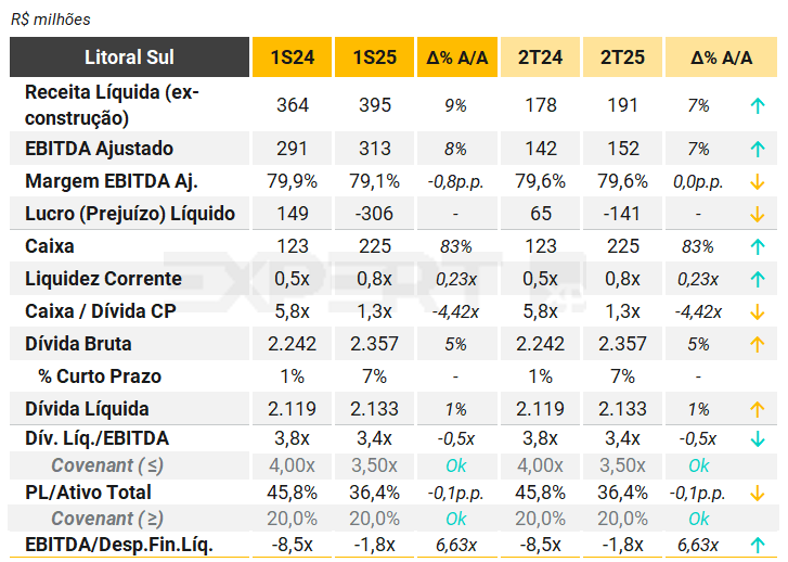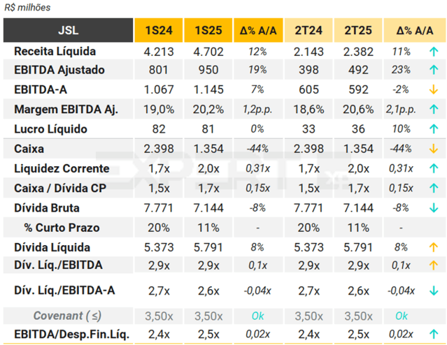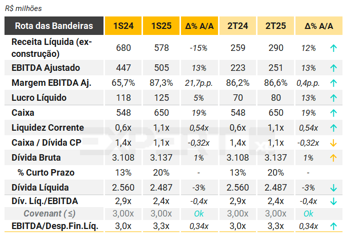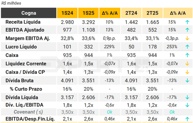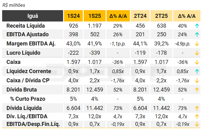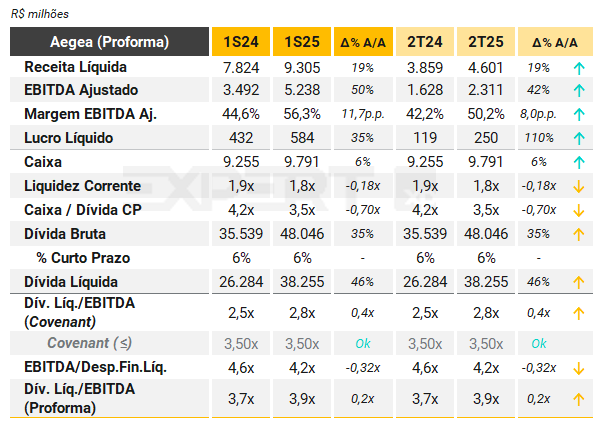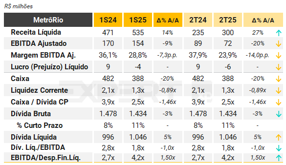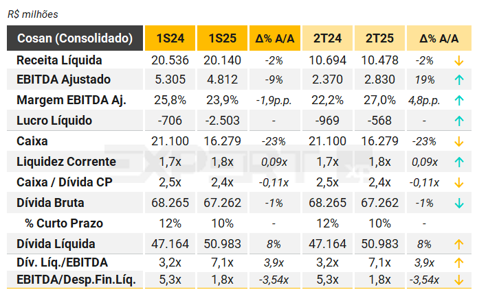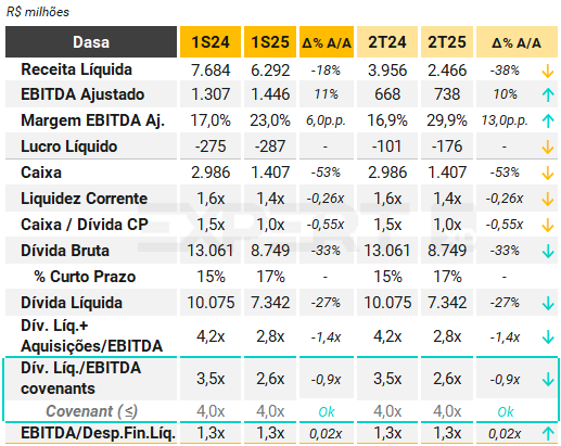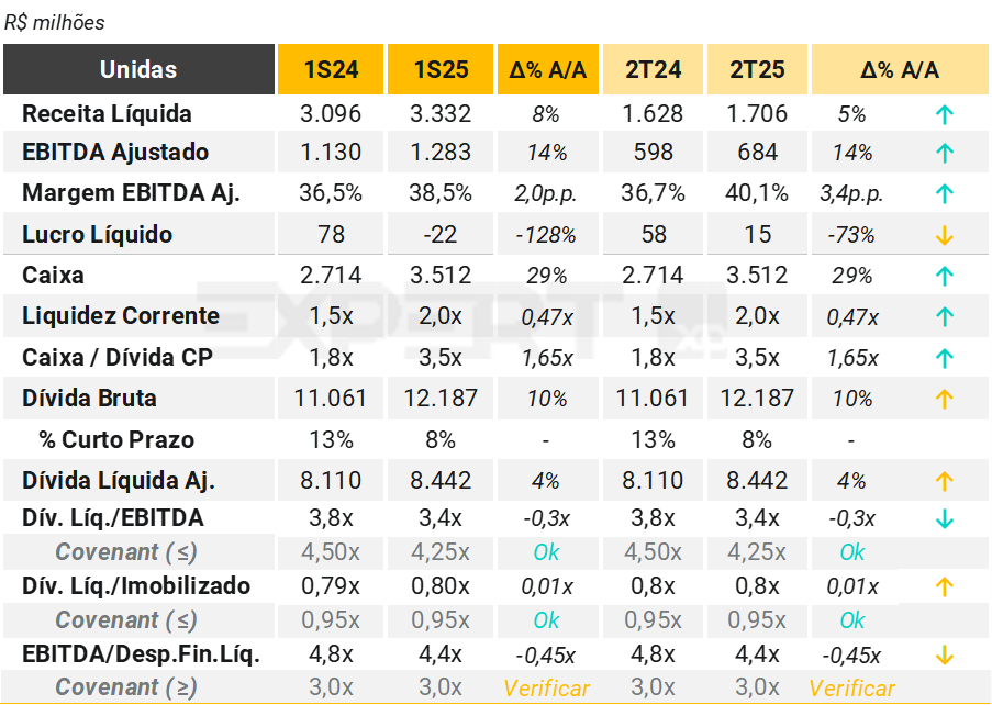 O EBITDA ajustado subiu 7% A/A no trimestre, com margem de 3,6%, refletindo maior eficiência operacional. No entanto, no acumulado do semestre, o EBITDA caiu 21% A/A, pressionado por itens não recorrentes, como desembolsos com programas de anistia fiscal e incorporações societárias, que geraram ajustes patrimoniais e contábeis.