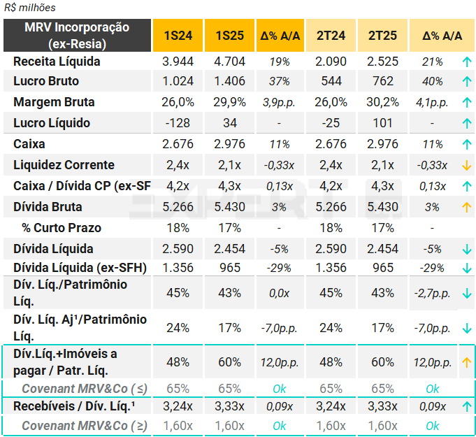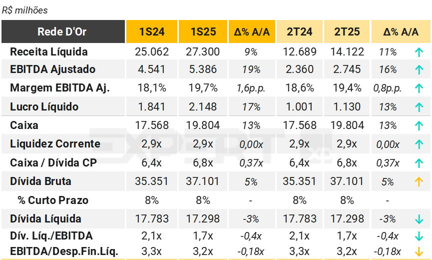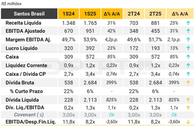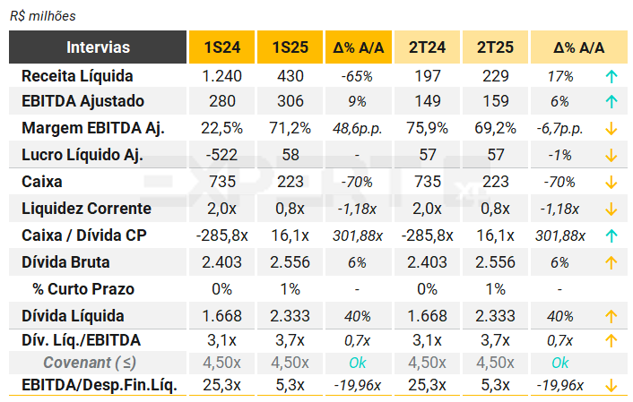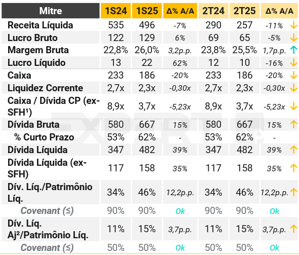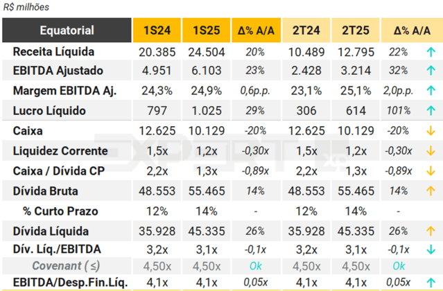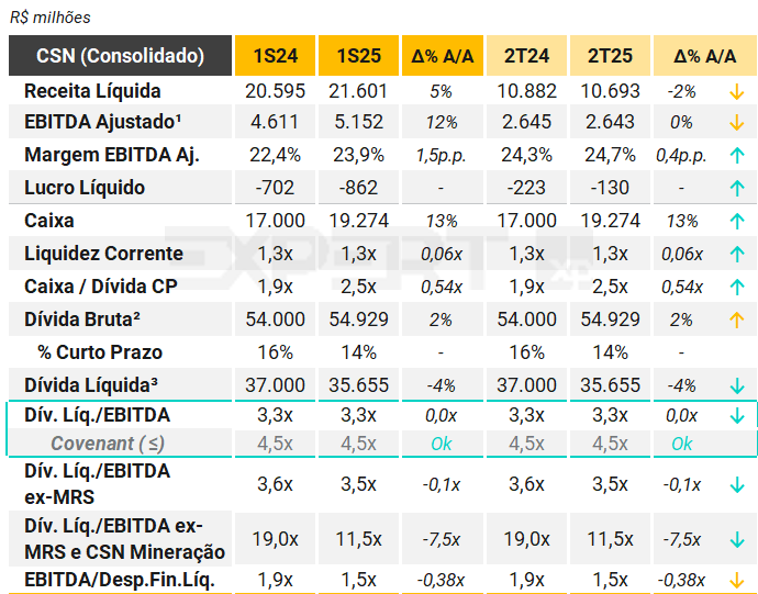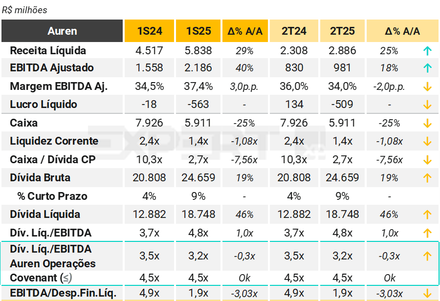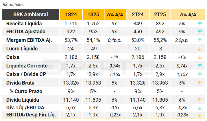 O EBITDA ajustado subiu 7% A/A no trimestre, com margem de 3,6%, refletindo maior eficiência operacional. No entanto, no acumulado do semestre, o EBITDA caiu 21% A/A, pressionado por itens não recorrentes, como desembolsos com programas de anistia fiscal e incorporações societárias, que geraram ajustes patrimoniais e contábeis.