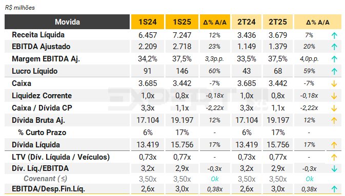 A Movida reportou resultados positivos. Destacamos a redução da alavancagem para 2,9x dívida líquida/EBITDA (vs. 3,2x no 2T24).