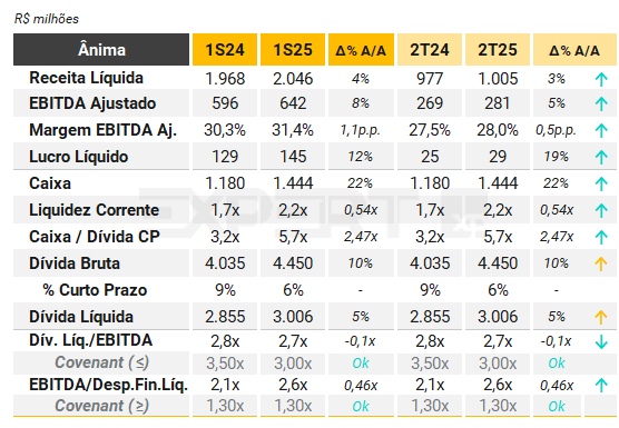 No 2T25, a Ânima manteve a trajetória de melhora na rentabilidade operacional e líquida. A receita líquida consolidada cresceu 2,9% em relação ao 2T24, com desempenho positivo em todas as verticais: Ânima Core (+0,2%), Ensino Digital (+18,1%) e Inspirali (+3,4%).