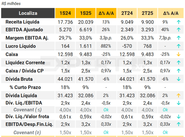 O lucro líquido ajustado foi de R$ 768 milhões, revertendo o prejuízo contábil do 2T24, que havia sido impactado por ajustes não recorrentes. A dívida líquida encerrou o trimestre em R$ 31,3 bilhões, com alavancagem de 2,36x dívida líquida/EBITDA LTM, frente a 2,83x no 2T24, em conformidade com seus covenants de 4,00x. A companhia mantém R$ 9,5 bilhões em caixa, suficientes para cobrir a dívida de curto prazo e compromissos com montadoras.