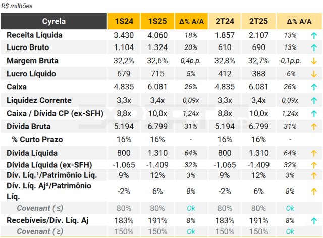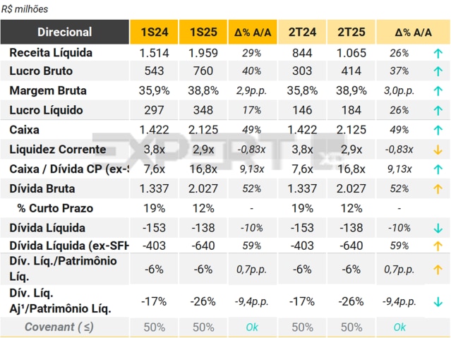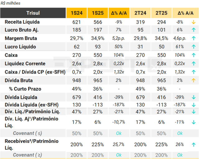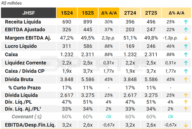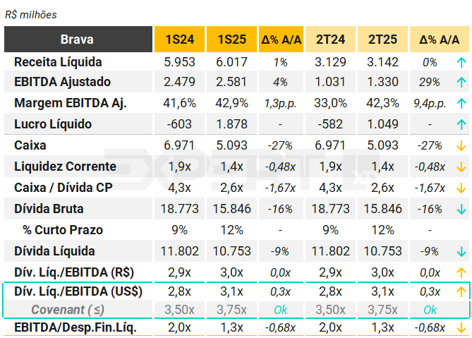 Apesar do ambiente operacional mais desafiador, a alavancagem medida por dívida líquida / EBITDA ajustado encerrou o 2T25 em 2,5x, +0,6x A/A, mas ainda com folga frente ao covenant de até 3,5x. Destacamos como positivo o avanço na estrutura de capital, com melhora nos indicadores de liquidez: a liquidez corrente subiu para 2,4x (+0,43x A/A) e o caixa sobre dívida de curto prazo atingiu 7,5x (+5,42x A/A), refletindo maior conforto financeiro no curto prazo.