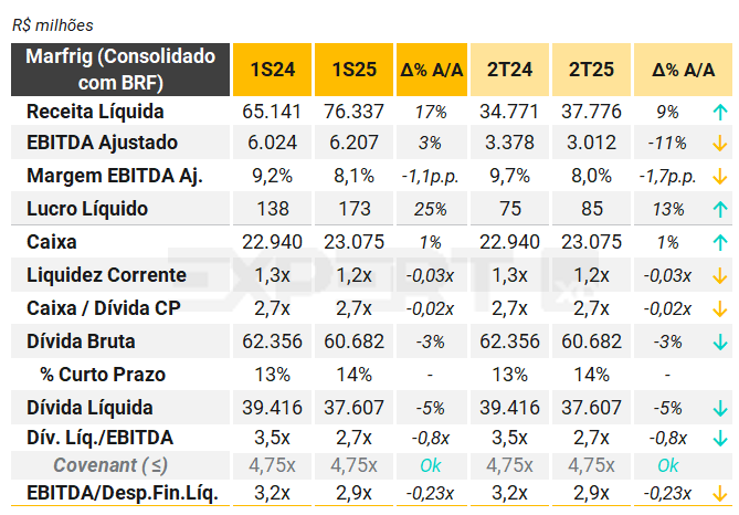 Como ponto de acompanhamento, o mercado aguarda os termos da fusão com a Marfrig: em agosto, foi aprovada a criação da MBRF pelos minoritários, e a Companhia espera finalizar o processo de unificação ao final do 3T25.