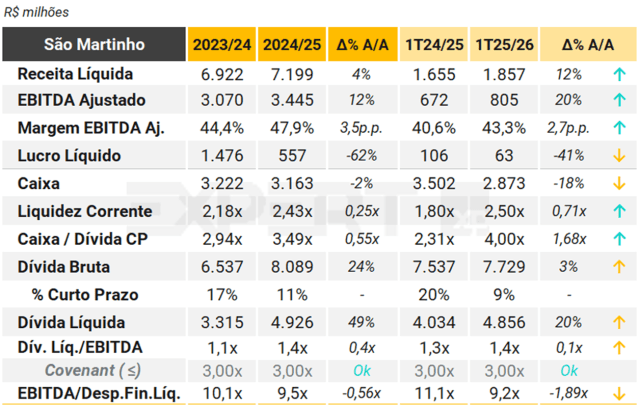 A dívida bruta encerrou o trimestre em R$ 4,29 bilhões (+31% A/A), com 76,4% no longo prazo. A posição de caixa era de R$ 2,2 bilhões, resultando em dívida líquida ajustada de R$ 1,81 bilhão (+42% A/A). A alavancagem subiu para 1,2x EBITDA (+0,4x A/A), ainda abaixo dos limites contratuais, com liquidez suficiente para cobrir vencimentos até a safra 2027/28.