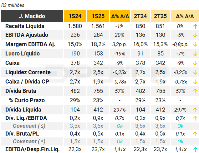 No 2T25, o volume de vendas da J. Macêdo totalizou 222,2 mil toneladas, queda de 1,9% em relação ao mesmo período de 2024. A receita líquida consolidada foi de R$ 850,9 milhões, praticamente estável (+0,1% A/A), refletindo desempenho misto entre as categorias: enquanto farinhas e farelos (47% da receita bruta) cresceram 8,7% A/A, massas (29%) e biscoitos (11%) apresentaram retrações de 1,5% e 6,9%, respectivamente, em volume.
