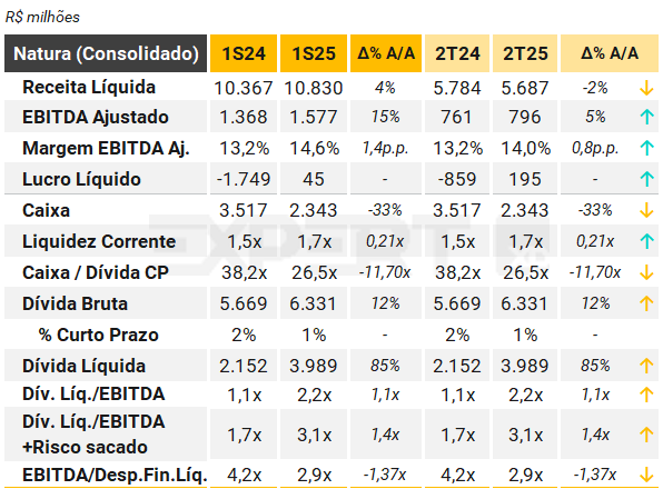 No 2T25, novamente a Natura apresentou resultados difíceis de interpretar, dada reclassificações contábeis por conta de gestão de ativos.