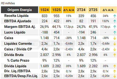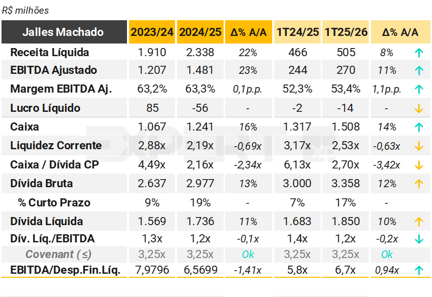 O EBITDA ajustado totalizou R$ 289,1 milhões no trimestre, alta de 32,3% A/A, com margem EBITDA ajustada de 33,9% (+1,2 p.p. A/A). O lucro líquido foi de R$ 242,7 milhões, avanço expressivo frente aos R$ 65,0 milhões registrados no 1T25, refletindo maiores receitas operacionais e ganhos não recorrentes com a venda da Biorigin.