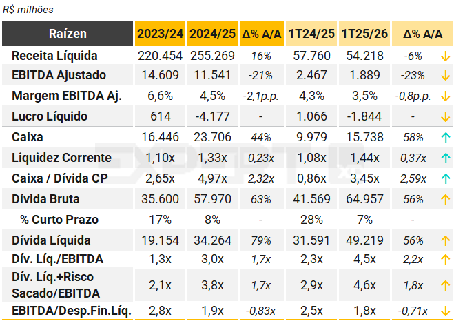 No 1T25/26, a Raízen apresentou um trimestre desafiador, marcado por: (i) aumento da alavancagem, impulsionada pela substituição de contratos com fornecedores (risco sacado) por dívida; (ii) ganhos de eficiência operacional ; (iii) condições climáticas adversas, que reduziram os volumes de moagem e limitaram a diluição de custos; e (iv) perdas em estoques na Distribuição de Combustíveis no Brasil, agravadas por uma parada de manutenção mais longa do que o esperado na Argentina.
