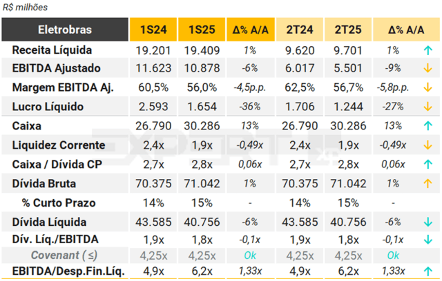 Apesar disso, ressaltamos que a Companhia mantém liquidez robusta, com R$ 15,7 bilhões em caixa e R$ 5,5 bilhões em linhas comprometidas, além de ter realizado novas captações de R$ 5,9 bilhões, incluindo bonds internacionais de 7 anos. O prazo médio do endividamento foi alongado para 8,2 anos – ante 6,0 anos A/A.
