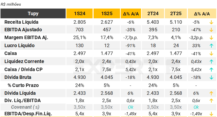 A dívida líquida da Tupy encerrou o 1S25 em R$ 2.568 milhões, alta de 6% A/A, refletindo a redução expressiva do caixa (-41% A/A), que passou de R$ 2.497 milhões para R$ 1.477 milhões. A dívida bruta, por sua vez, caiu 18% A/A, totalizando R$ 4.045 milhões.