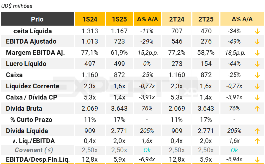 Compass. O EBITDA normalizado atingiu R$ 1,2 bilhão (+10% A/A), impulsionado por um aumento de 9% a/a nos volumes de distribuição de gás natural, que atingiram 15 milhões de m³/dia. O EBITDA reportado ficou em cerca de R$ 1,3 bilhão, apoiado por ganhos não recorrentes com arbitragem de cargas de GNL. O EBITDA do 1S25, de R$ 2,5 bilhões, sugere que a empresa está a caminho de atingir a metade superior de seu guidance para o ano, de R$ 4,7 bilhões a R$ 5,1 bilhões. O Capex do primeiro semestre, de R$ 904 milhões, está bem dentro da faixa esperada, alinhado com o guidance anual de R$ 2,0 bilhões a R$ 2,3 bilhões. Por fim, a dívida líquida ficou em R$ 9,8 bilhões, uma queda de R$ 408 milhões em relação ao trimestre anterior, enquanto a alavancagem permaneceu estável em 1,9x.