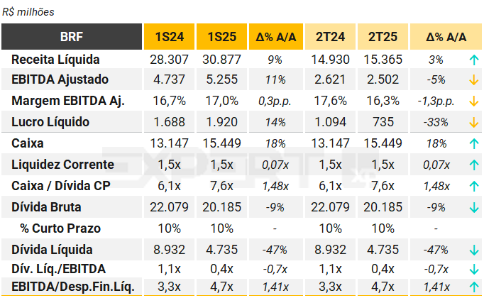 Alocação de Capital: No 2T25, a BRF atingiu sua menor alavancagem histórica, com 0,4x dívida líquida/EBITDA (a Companhia não possui covenant). Essa posição confortável sustenta o guidance da Companhia para Capex, com espaço para especulações de M&A, e os esperados R$ 3,5 bilhões em dividendos a serem distribuídos no processo de fusão.