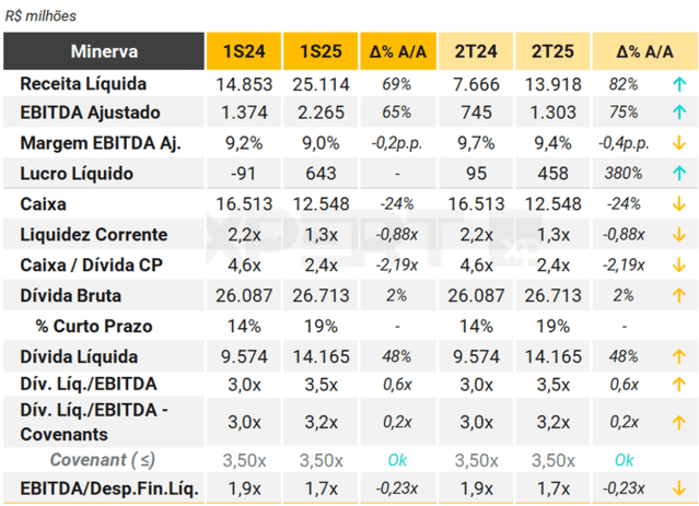 A diversificação geográfica continua sendo um dos pilares da estratégia da Minerva. Com presença em sete países e exportações representando 60% da receita bruta, a companhia se beneficia da capacidade de arbitrar mercados e mitigar riscos. A integração dos novos ativos tem superado as expectativas, com crescimento de 104% na receita e 50% no volume de vendas em relação ao trimestre anterior. A alavancagem líquida foi reduzida para 3,16x (vs. 3,7x no 1T25), apoiada por uma posição de caixa robusta de R$ 12,5 bilhões e pela recompra de US$ 309 milhões em bonds ao longo do ano.