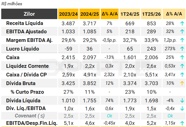 Biorigin: Em 30 de maio de 2025, a Zilor concluiu a venda de 70% da Biorigin S.A. para o grupo francês Lesaffre, em operação que envolveu os segmentos de alimentação humana e nutrição animal. A transação gerou entrada de caixa de R$ 665,6 milhões e impacto positivo de R$ 354 milhões em outras receitas operacionais, incluindo ganho de capital e baixa de ativos intangíveis. A partir do 1T25/26, os resultados da Biorigin passaram a ser registrados por equivalência patrimonial, e o negócio de levedura mantido pela Zilor foi realocado para o segmento de agronegócio. O 1T24/25 foi reapresentado para refletir essa nova estrutura contábil.