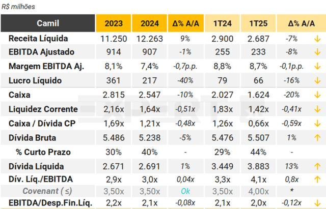 Notas: O 1T25 da Camil é consolidado em maio de 2025. (*) A medição do covenant da Camil é realizada de forma anual. Portanto, apesar de estar acima da clásula no 1T25, a alta alavancagem de Camil não incorre em penalidades.