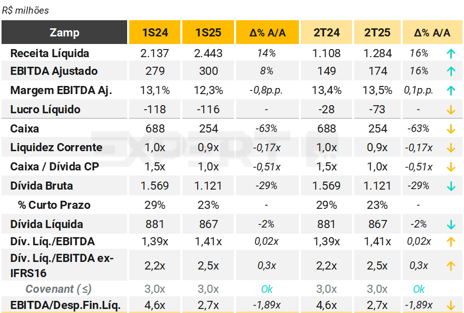A alavancagem da Zamp encerrou o 2T25 em 2,5x, acima dos trimestres anteriores, mas ainda abaixo do limite de 3,0x previsto nos covenants financeiros. A Companhia segue em conformidade com suas obrigações contratuais.