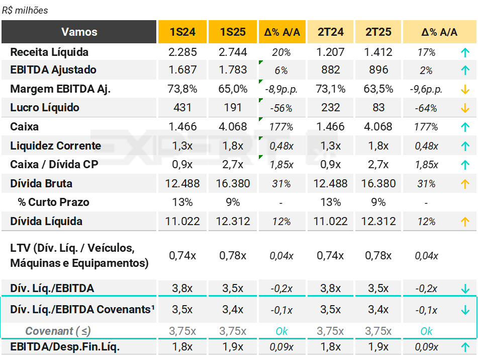 Alavancagem: A dívida líquida da companhia aumentou 12% A/A, totalizando 12.312 milhões de reais no 2T25. O indicador de alavancagem (dívida líquida/EBITDA ajustado) ficou em 3,36x, abaixo do limite de covenant de 3,75x, mas ainda elevado. O LTV (dívida líquida sobre veículos, máquinas e equipamentos) subiu de 0,74x para 0,78x (+0,04x A/A), e a liquidez corrente melhorou de 1,3x para 1,8x, refletindo o aumento expressivo do caixa (+177% A/A). Segundo nossos cálculos, a relação entre EBITDA e despesa financeira líquida ficou em 1,9x, abaixo do covenant mínimo de 2,0x, o que exige atenção.