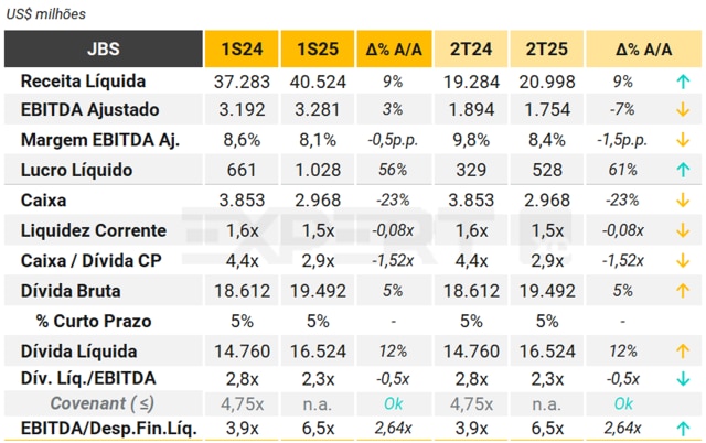 Por outro lado, a operação de carne bovina na América do Norte enfrentou forte pressão, com EBITDA negativo de US$233 milhões, refletindo o estreitamento entre os preços do gado e da carne, além de restrições comerciais e sanitárias. A JBS USA Pork também foi impactada por restrições comerciais, mas manteve EBITDA positivo de US$253,6 milhões.