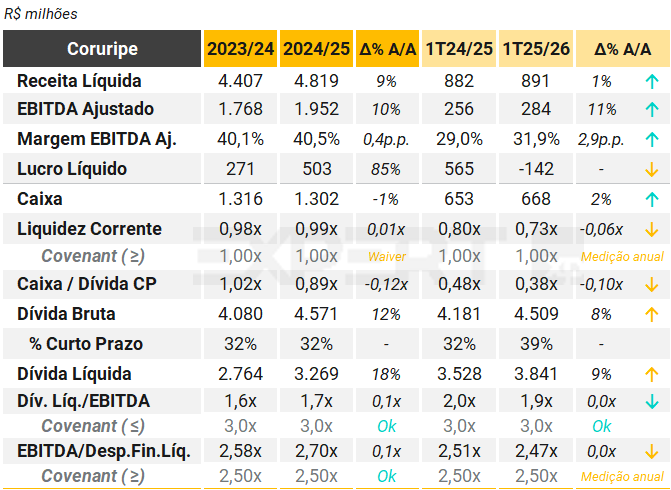 No primeiro trimestre da safra 2025/26, a Coruripe apresentou desempenho operacional mais fraco em relação ao mesmo período da safra anterior, refletindo os impactos climáticos adversos. A moagem de cana totalizou 4,2 milhões de toneladas (-17,5% A/A), com queda tanto na cana própria (-10,2%) quanto na de terceiros (-21,5%). A produtividade agrícola também foi pressionada, com TCH¹ de 77,4 ton/ha (-13,1% A/A) e ATR² de 120,7 kg/ton (-2,8% A/A). A produção industrial acompanhou essa tendência, com queda de 19,5% no açúcar equivalente e de 35,3% no etanol total. A geração de energia elétrica recuou 13,9% A/A, embora a eficiência industrial tenha se mantido estável em 89,7%. Apesar da queda nos volumes, os preços médios do etanol apresentaram alta relevante (+16,3% A/A), com destaque para o hidratado (+15,6%) e o anidro (+16,7%). Já os preços do açúcar VHP e cristal recuaram levemente (-0,4% e -3,8%, respectivamente). Com isso, a receita líquida cresceu 1% A/A, atingindo R$ 891 milhões, impulsionada principalmente pelo etanol (+27,7% A/A). O EBITDA ajustado foi de R$ 284 milhões (+11% A/A), com margem de 31,9%, refletindo ganhos de preço e controle de custos. No entanto, o resultado líquido foi negativo em R$ 142 milhões, revertendo lucro de R$ 565 milhões no mesmo período da safra anterior, devido ao forte impacto das despesas financeiras líquidas (R$ 361 milhões) e à ausência de efeitos extraordinários como créditos tributários e variações cambiais positivas. O capex no trimestre foi de R$ 393 milhões, concentrado em manutenção, plantio e tratos culturais. A dívida líquida aumentou para R$ 3,84 bilhões (+8,9% A/A), com alavancagem dívida líquida/EBITDA ajustado em 1,9x no trimestre, praticamente estável A/A. No entanto, a liquidez permaneceu pressionada, com caixa de R$ 668 milhões frente a dívida de curto prazo de R$ 1,8 bilhão. Ainda que os covenants da Coruripe possuam medição apenas anual (em março de cada exercício social), chamamos atenção para o menor índice de liquidez corrente, que encerrou em 0,73x, frente ao covenant de pelo menos 1,0x. Na última safra, a Companhia obteve anuência dos credores (waiver).
