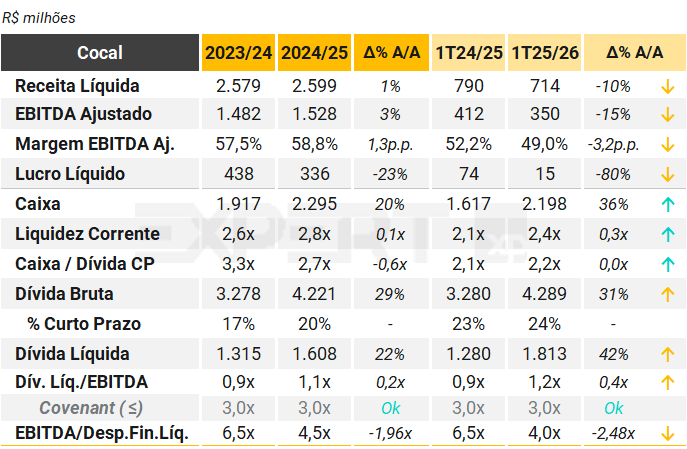 No 1T25/26, a Cocal reportou receita líquida consolidada de R$ 714 milhões, queda de 9,6% A/A, refletindo menor volume de produção devido a condições climáticas adversas. O EBITDA ajustado foi de R$ 350 milhões, -15,1% A/A, com margem de 49,0% (-3,2 p.p.), enquanto o lucro líquido caiu para R$ 14,9 milhões, -80,0% A/A, pressionado por maiores despesas financeiras e menor diluição de custos fixos.
