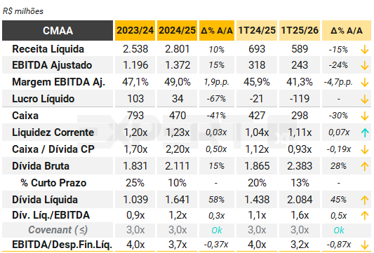 No 1T2025/26, a CMAA reportou receita líquida de R$ 588,9 milhões no 1T26, queda de 15,0% em relação ao mesmo período do ciclo anterior, refletindo a menor disponibilidade de matéria-prima e redução nos volumes comercializados. O EBITDA ajustado totalizou R$ 243,0 milhões, recuo de 23,6% A/A, com margem EBITDA de 41,3% (-4,7 p.p.), pressionado pela menor diluição de custos fixos.