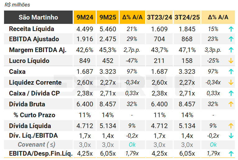 No 3T24/25 (dez/24), a São Martinho apresentou crescimento nos resultados operacionais, com receita líquida de R$ 1,8 bilhões (+28% A/A) e EBITDA ajustado ex-créditos fiscais de R$ 868 milhões (+23% A/A). Apesar disso, a performance foi mista entre as unidades de negócio. O lucro líquido, por sua vez, apresentou queda, considerando maiores despesas financeiras e eventos não recorrentes.