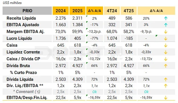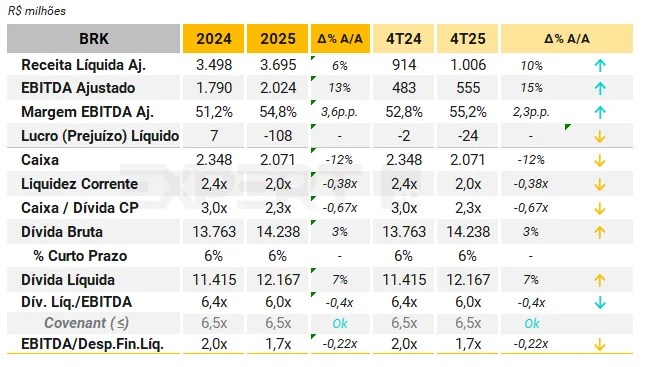 A receita líquida somou R$ 427 milhões no 4T25, retração de 1% A/A. O EBITDA ajustado totalizou R$ 227 milhões no trimestre (+10% A/A), com margem de 53,2% (vs. 48,1% no 4T24). Ainda assim, a Companhia reportou prejuízo líquido ajustado de R$ 10 milhões, impactado pelo elevado custo da dívida e pela marcação a mercado das debêntures.