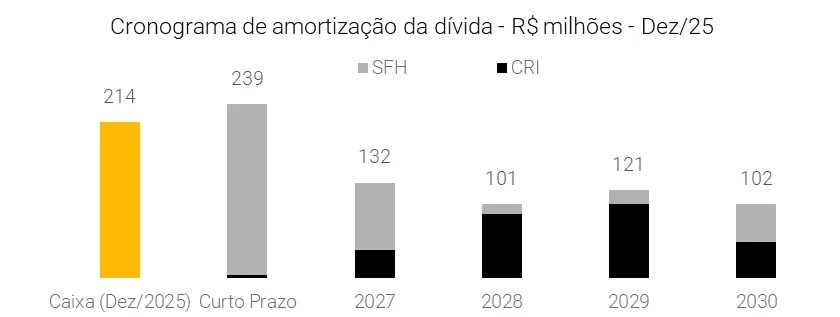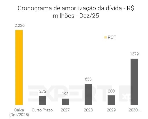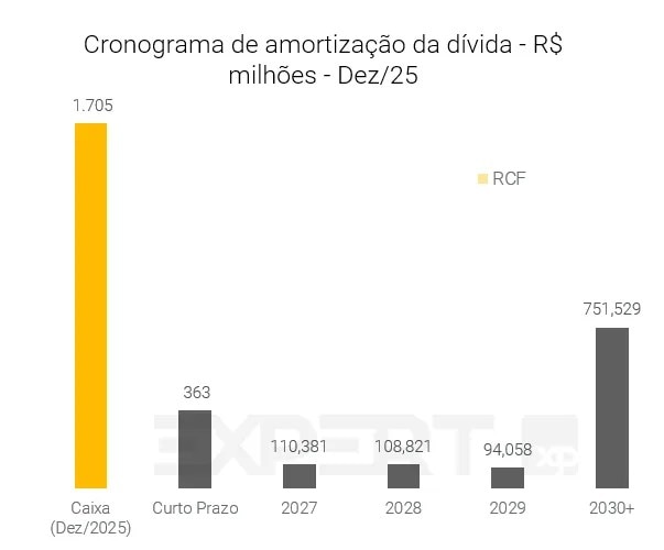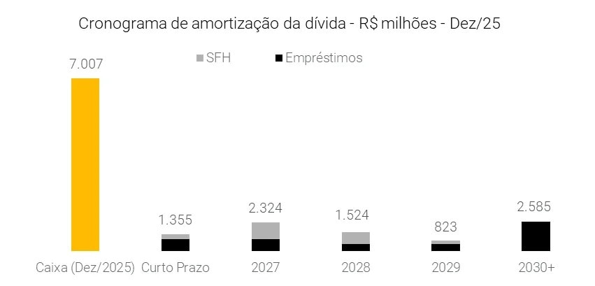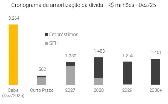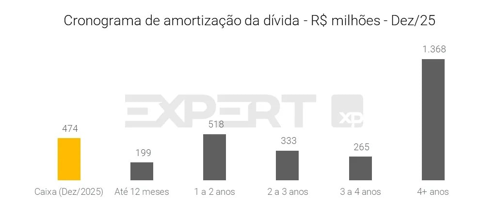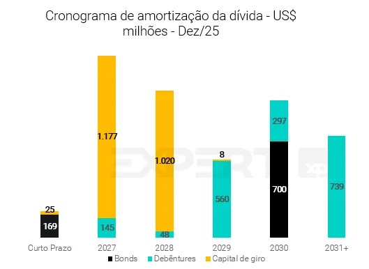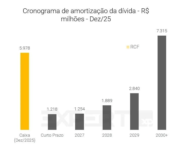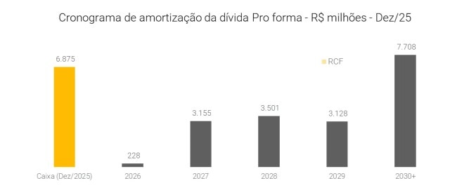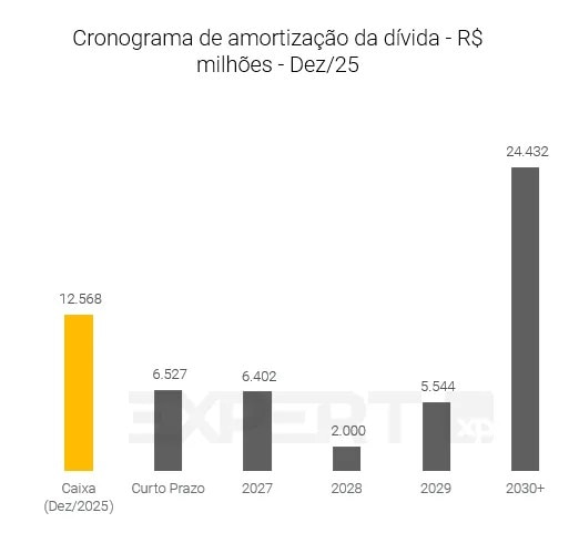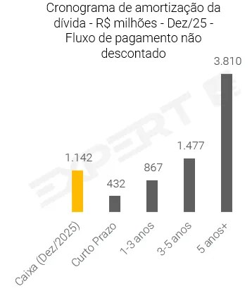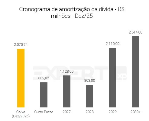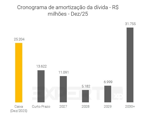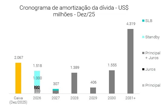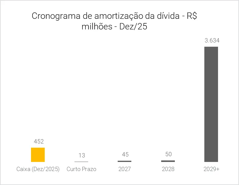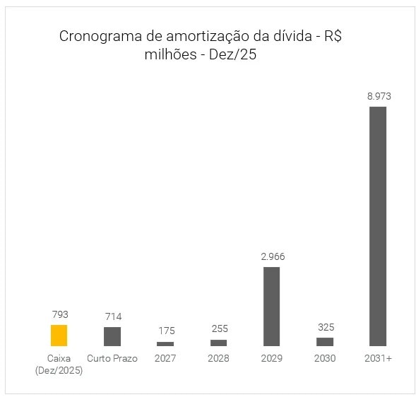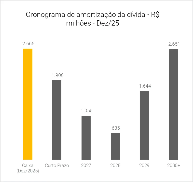 Quanto à liquidez, houve redução da parcela de curto prazo da dívida para 12% (ante 15% ao final de 2024) e avanço do indicador caixa/dívida de curto prazo para 1,6x. Por outro lado, a liquidez corrente recuou de 1,3x para 1,1x. A posição de caixa ao final de dezembro de 2025 é suficiente para cobrir as amortizações da dívida apenas até parte de 2027, mantendo a necessidade de gestão ativa do perfil de vencimentos.