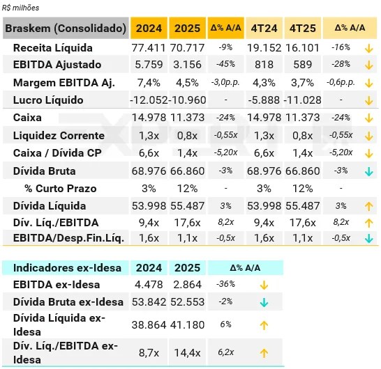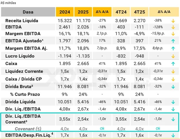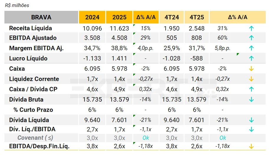 [Comentário do time de Equities]: “A queima de caixa ficou quase R$ 200 milhões abaixo da Projeção XP (melhores prazos com fornecedores), levando a Dívida Líquida/EBITDA a 4,2x (vs. 4,3x projetado), provavelmente marcando o pico anual de alavancagem em função da sazonalidade do capital de giro — nossa estimativa para fev/26 aponta 2,8x.”