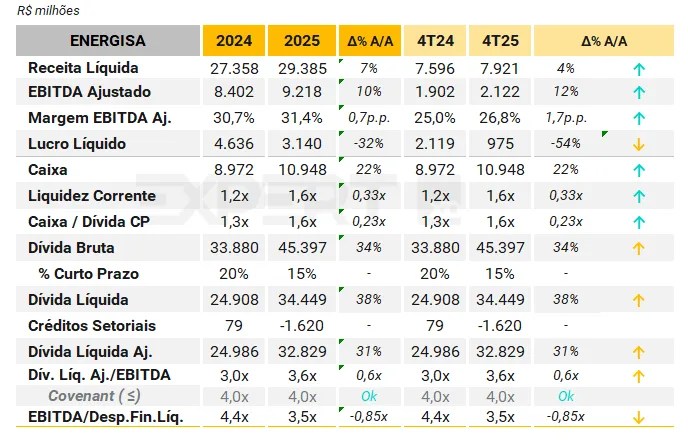 A dívida bruta subiu para R$ 40,1 bilhões em 2025 (+59% A/A), movimento associado à aceleração do capex de R$ 15,2 bilhões, ligado a universalização, expansão da rede e resiliência hídrica. A dívida líquida avançou para R$ 27,8 bilhões (+40% A/A), levando a alavancagem de 2,1x (vs. 1,8x) dívida líquida/EBITDA. A cobertura de juros caiu para 5,3x (de 8,0x), refletindo o maior estoque médio de dívida ao longo do ano.