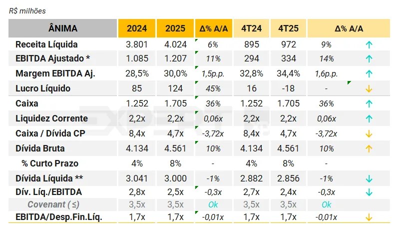 No 4T25, a Ânima combinou melhora operacional com relativa estabilidade nas contas. A receita líquida avançou 8,6% versus o 4T24, para R$ 972,3 milhões, sustentada por crescimento em todas as verticais, com destaque para a Inspirali, cuja receita subiu 15,6%, apoiada por elevação no tíquete e crescimento da base de alunos de graduação em medicina, enquanto o core cresceu 4,5% mesmo com base 2,1% menor, reflexo de tíquete 6,8% maior, reforçando a estratégia de priorização de qualidade de receita.