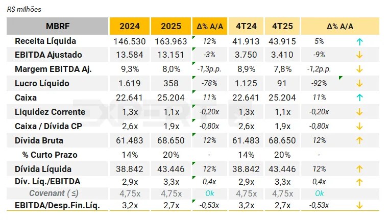 A queda do lucro líquido para R$ 91 milhões no trimestre, ante R$ 1,125 bilhão no 4T24, decorreu de uma combinação de menor resultado operacional com despesas de reestruturação e incorporação da BRF, explicitamente citadas na reconciliação do EBITDA ajustado. O resultado financeiro líquido ficou em R$ 2,121 bilhões negativos, refletindo principalmente o maior nível médio de endividamento e o patamar ainda elevado das taxas de juros.