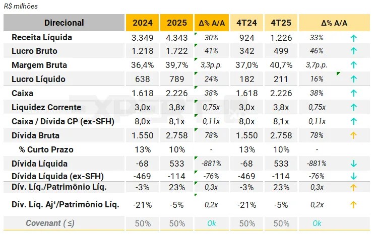 Aliada ao avanço operacional, a dívida bruta fechou 2025 em R$1,12 bilhão, com 17% no curto prazo. A dívida líquida encerrou em R$ 705 milhões. Em novembro, a 7ª emissão adicionou R$240 milhões e alongou parte relevante do perfil até 2030. A liquidez segue sólida, com caixa de R$415,8 milhões. Já a alavancagem, medida por dívida líquida/EBITDA, encerrou o ano em 1,4x (vs. 0,5x no 4T24), com folga confortável frente ao covenant de 3,5x. Em nossa visão, essa elevação A/A é compatível com o ciclo de expansão em curso.