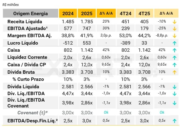 O EBITDA ajustado somou R$ 338,0 milhões (+19,5% A/A), com margem de 35,9% (+3,4 p.p. A/A), sustentado por preços e volumes de etanol/energia, menores despesas após a venda da Biorigin e contribuição da USB (R$ 35,8 milhões de EBITDA ajustado da USB). O EBIT ajustado foi de R$ 147,4 milhões (+21,7% A/A), com margem de 15,7% (+1,7 p.p. A/A). O lucro líquido do trimestre foi -R$ 32,7 milhões (margem -3,5%), impactado por efeito não caixa de variação negativa do ativo biológico e maiores custos atrelados à USB, apesar do resultado operacional mais forte.