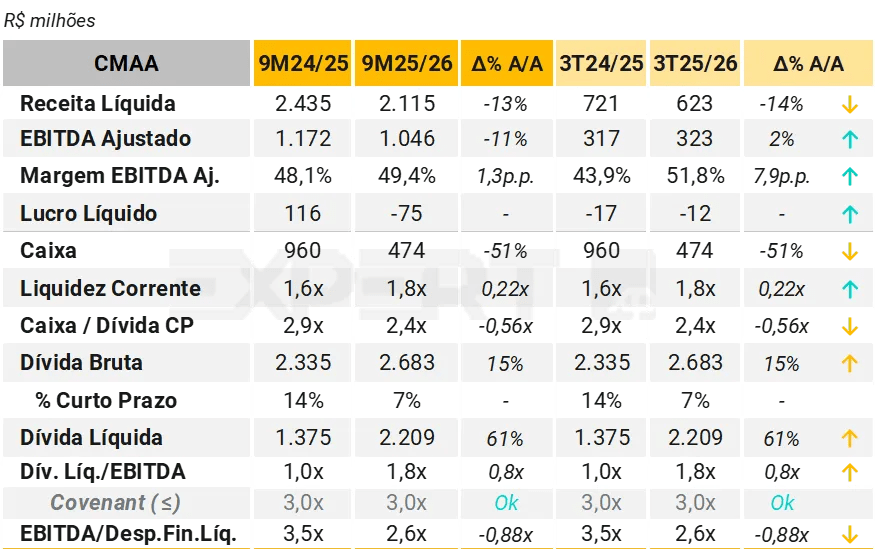No 3T25/26, a CMAA reportou receita líquida de R$ 623 milhões, retração de 14% A/A, refletindo principalmente a menor moagem de cana no trimestre, impactada pelas condições climáticas adversas ao longo da safra 2025/26.