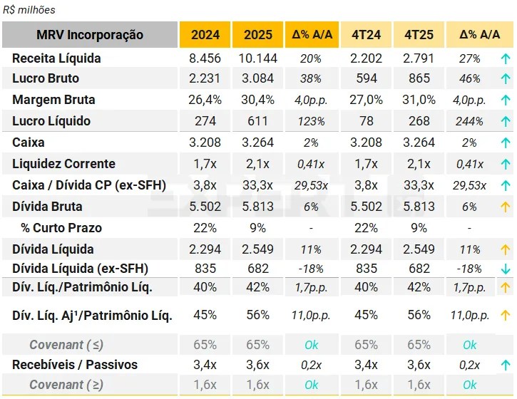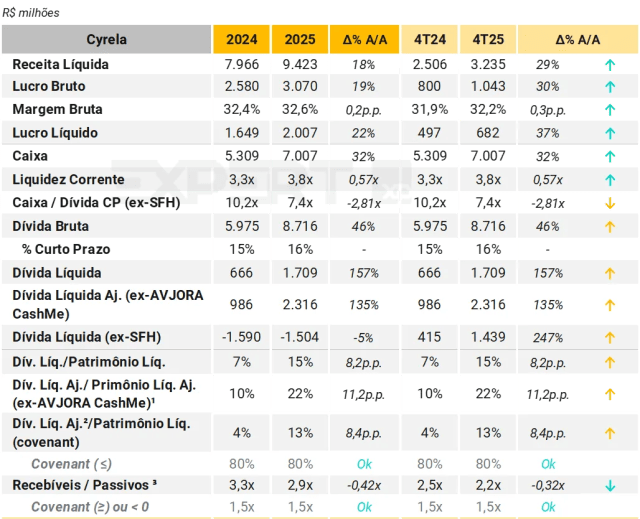 O EBITDA ajustado totalizou R$ 2,49 bilhões (+22% A/A), com margem de 10,7% (+0,7 p.p.), e o lucro líquido somou R$ 955 milhões (+3% A/A). A dívida bruta permaneceu estável em R$ 7,3 bilhões, enquanto a dívida líquida avançou para R$ 6,6 bilhões (+6% A/A), influenciada pela redução do caixa para R$ 684 milhões. A alavancagem líquida caiu de 3,1x para 2,7x EBITDA, com melhora simultânea do índice Dívida Líquida/Patrimônio Líquido para 1,2x (ante 1,3x) e da liquidez corrente para 1,7x (ante 1,6x). Em 2025, todos os covenants¹ foram atendidos.