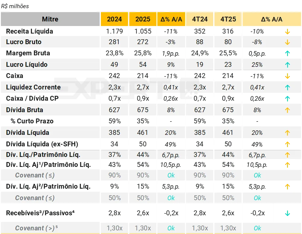 Para o encerramento do ano fiscal em fevereiro de 2026, a empresa ainda precisará reduzir a alavancagem para cumprir o covenant de 4,0x. Além desse ponto, permanecem no radar o recuo do indicador EBITDA/Despesas Financeiras Líquidas para 1,8x (ante 2,2x A/A) e a queda da liquidez corrente de 2,0x para 1,8x, reforçando a necessidade de disciplina financeira no curto prazo.