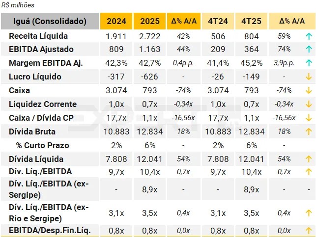 O capex somou R$ 299,2 milhões no 4T25 (+73,0% A/A) e R$ 828,2 milhões em 2025 (+28,1% A/A), direcionado majoritariamente às operações de Sergipe, Rio de Janeiro e Cuiabá. Os investimentos seguem alinhados aos contratos de concessão, com foco em expansão de redes, modernização de estações e aumento da eficiência operacional, sustentando a perspectiva de crescimento da geração de caixa no médio prazo. No 4T25, a Iguá registrou consumo de caixa de aproximadamente R$ 315 milhões, refletindo capex e despesas financeiras relevantes, o que levou a redução do caixa e aplicações de R$ 1,11 bi no 3T25 para R$ 793 milhões no 4T25.