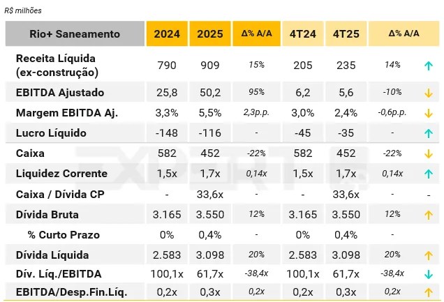 A dívida líquida atingiu R$ 3,1 bilhões, com endividamento majoritariamente composto por debêntures indexadas ao IPCA, com vencimentos longos (2043 e 2052) e custo entre IPCA+6,79% e IPCA+7,33% a.a. Os covenants financeiros possuem exigibilidade apenas após os marcos de completion (a partir de 2027). Vale destacar que, em jun/25, a AGENERSA reconheceu o direito da Rio+ ao reequilíbrio econômico-financeiro pelas economias na Tarifa Social acima do limite contratual de 7,5%, com compensação via abatimento da 3ª parcela da outorga fixa (aprox. R$ 300 milhões). No entanto, o processo foi encerrado sem acordo em jan/26 e aguarda decisão final do regulador. O pagamento da parcela permanece suspenso, sem caracterizar descumprimento contratual.