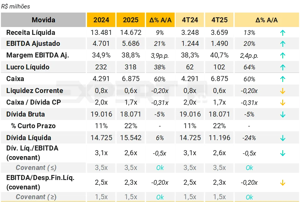 Além disso, nos primeiros meses de 2026, a Movida deu continuidade à sua estratégia de gestão ativa da estrutura de capital, com captações realizadas entre janeiro e fevereiro que somaram R$ 3,5 bilhões. As operações incluíram a 25ª e a 26ª emissões de debêntures, rolagem de dívidas existentes e financiamentos internacionais, contribuindo para o alongamento do perfil da dívida.