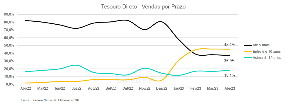 Em relação ao prazo de emissão, 18,1% das vendas no Tesouro Direto no mês corresponderam a títulos com vencimento acima de 10 anos, seguido pela venda de títulos com prazo entre 5 e 10 anos, com 45,1%, e das com prazo entre 1 e 5 anos, com 36,9% do total. Desde o início de 2023, nota-se um maior interesse por títulos de médio e longo prazo, em detrimento de títulos até 5 anos.