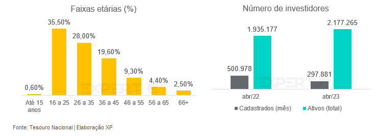 Em abril, o número de investidores cadastrados no programa teve acréscimo de 297.881 novos participantes, atingindo 24.022.028. Deste total, a parcela de 2.177.265 são de investidores ativos (aqueles que possuem investimentos de fato), cerca de 9% da base, um acréscimo de 35.730 no mês de abril em relação a março, e 242.088 a mais do que em abril de 2022.